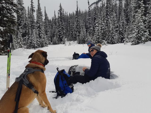 Wie had dat gedacht dat we in april nog de snowshoes uit de kast moesten halen om een hike te doen... Het had in town al gesneeuwd maar het meeste was de volgende dag al weer gesmolten door de zon. Maar in de bergen was er zondagnacht nog even wat bij gevallen. Maandag was de dag dat de 3 musketiers weer op pad gingen. Ella kon dit keer ook mee want ik was de chauffeur.
