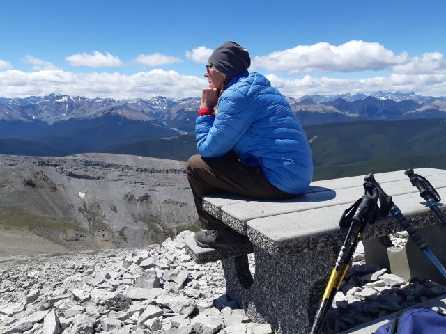 Op de top was een stenen picknick tafel waar we even gezeten hebben. De wind was hard en best wel fris. Dus muts en jas aan! Helaas was het niet meer mogelijk om op het heli platform te zitten. Ze hadden dat nu afgeschermd. De weg terug was even goed opletten waar je je voeten neerzette, want die kleine steentjes glijden. Total maar 10 mensen tegen gekomen, heerlijk! Altijd beren spray mee, want je weet maar nooit. We zijn eigenlijk nog nooit een beer van heel dichtbij tegen gekomen. Altijd van een afstand en ze bemoeien zich met hun eigen zaken. Dat is goed.