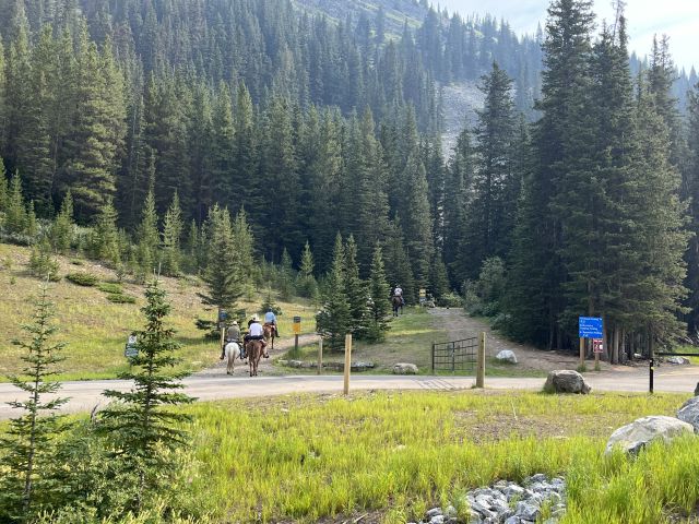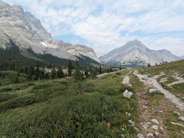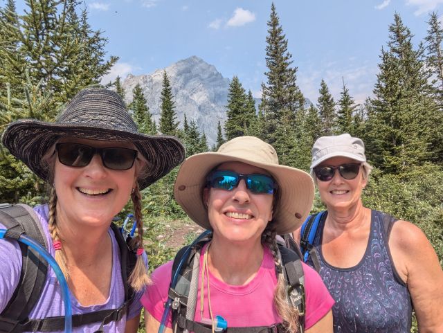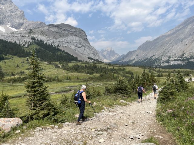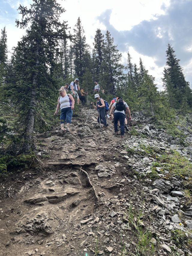 Zaterdag 3 augustus: Barbara, Joanne en Bill gingen mee. Ik reed ons naar Kananaskis over de Highwood pas naar het begin van de hike. Het was al vol met de auto's toen we aankwamen en we moesten langs de weg parkeren. Het weer was prachtig. De route begon gelijk omhoog de 200 meter die we moeten stijgen om bij Elbow Lake te komen. Daar kun je ook kamperen. Was ook een idee voor dit jaar. Maar die heup gooit alles in het roet.