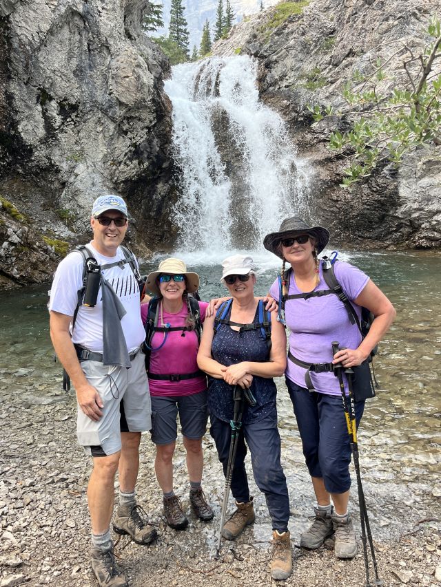 Het steile klimmetje omlaag naar de voet van de waterval was best een uitdaging. Maar toch gelukt! Rustig aan liepen we weer terug naar de mooie weides waar er mooie rotsen lagen om op te zitten voor lunch. We genoten van het uitzicht de zachte wind en de stilte.