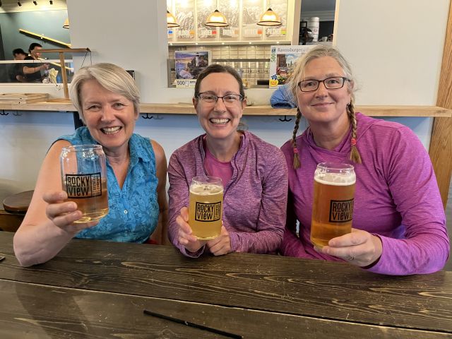 Terug in de auto belde Bill Mark, zodat hij een reservering kon maken bij een restaurant op het terras, waar het niet toen we aankwamen het met bakken uit de hemel kwam! Binnend konden we ook zitten bij de brewery!