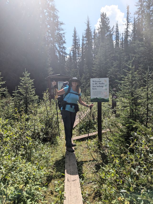 Joanne met een Garmin tracer voor als er iets gebeurd, ieder beerspray en stokken en een volle rugzak! De trip startte in Peterlougheed/Kananaskis dicht bij het lower lake. Daar parkeerden we de auto en de trailhead was goed aangegeven. Gelijk omhoog!